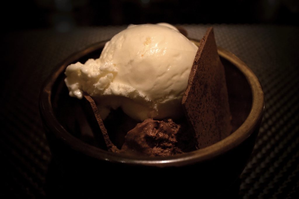 Although we just about had enough room left to finish our wine, the waiter talked us both into getting a dessert. In all honesty, it didn’t take much to persuade us and before we knew it, we we’re presented with our final course of the evening. Asmita finished her meal with the Dark Chocolate Mousse with Tangerine and Malted Milk, which was accompanied by a soft scoop of smooth, creamy vanilla ice cream. This balanced out the bittersweet caramel that was hidden in the rich chocolate mousse perfectly.