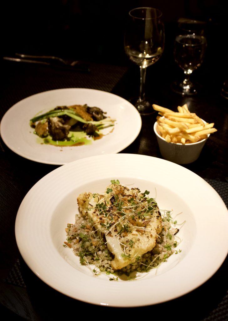 My main course was the vegetarian option of Slow Roasted and Caramelised Cauliflower with Tunworth and Buckwheat Risotto. I wanted to steer away from my typical choices and I’m partial to a veggie meal, so thought this was an exciting option. It’s safe to say, my main alone could have gone between the two of us. The portions were huge and filled with flavour, what more could you want? We were thoroughly enjoying our meals, accompanied by our 2017 Dominique Cornin wine, in a low-lit booth.